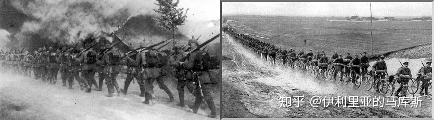 德第1集团军从法国燃烧的村镇中走过,他们也有大量的自行车部队参与到了行进当中