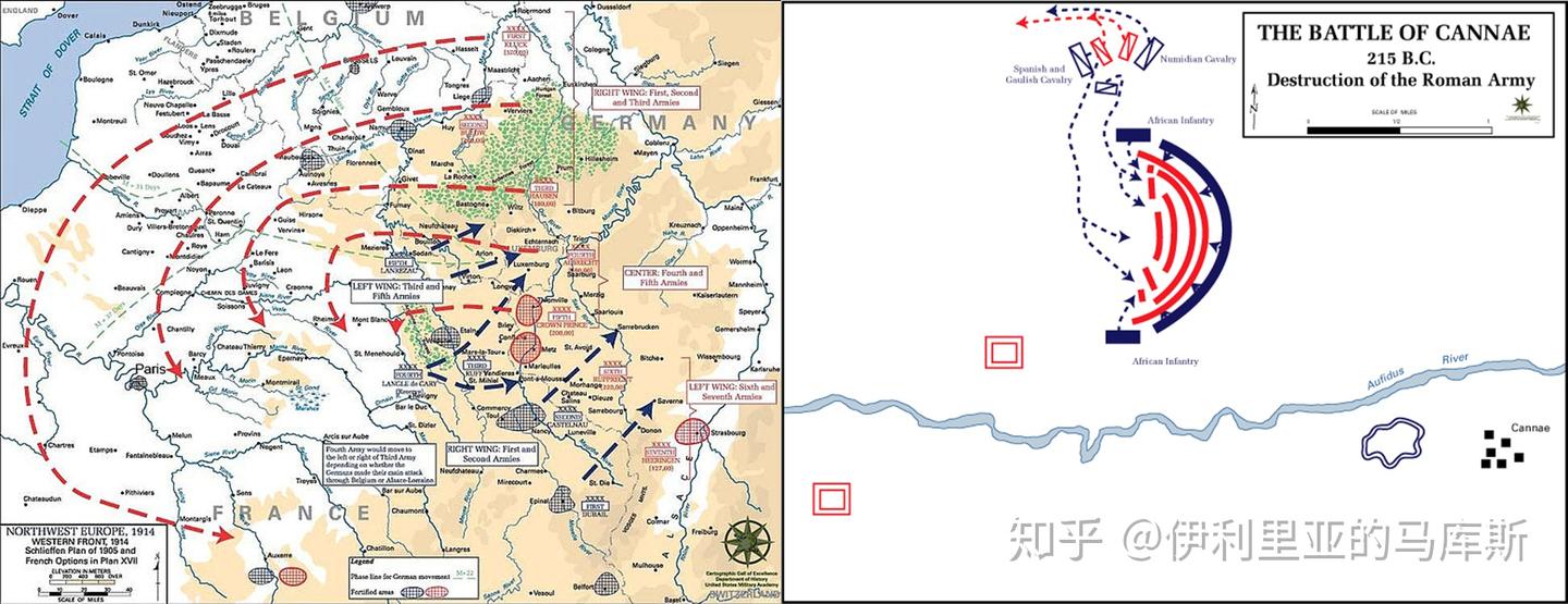 从左到右:“施利芬计划”的右钩拳和坎尼战役的两翼合围
