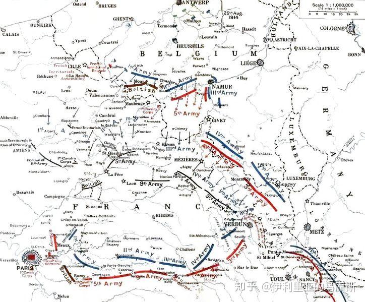 到了16日,随着列日的打通,德军的右翼才算真正在比利时境内铺开,不过大约4万名比利时军队成功撤退到了海港安特卫普,并在那里继续威胁德军的右翼。不过德国人已经顾不了这些在自己身后的敌人了,他们需要把耽误的时间补回来。在20日攻占布鲁塞尔后,德军还是转向西南,向着比法边境前进。