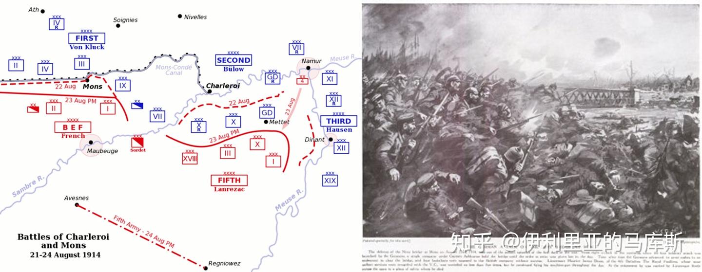 从左到右:沙勒罗瓦和蒙斯战役的形势图,蒙斯战役中开始冲锋的德军