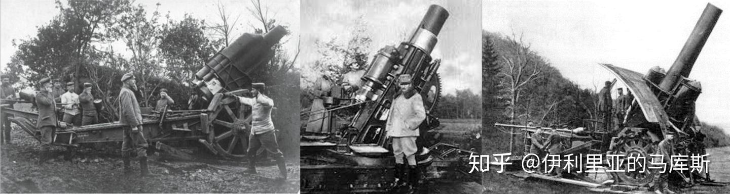 从左到右:攻打列日的“怪物们”,210mm毛瑟臼炮,305mm斯柯达臼炮和420mm克虏伯臼炮