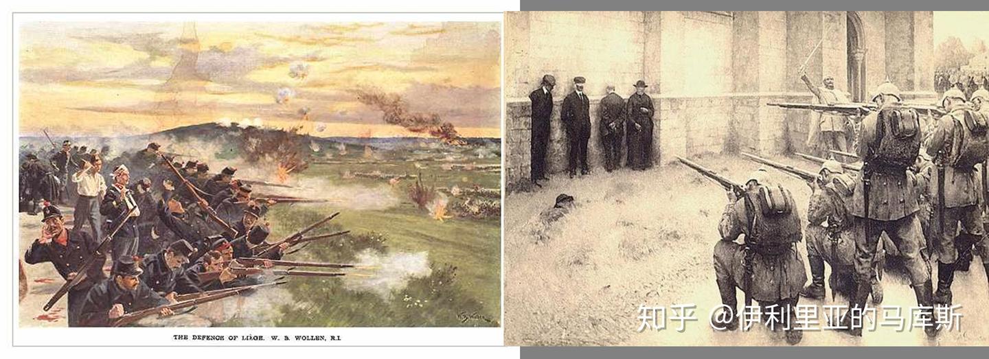 从左到右:列日战役中英勇防守的比利时军队,事后处决平民泄愤的德军