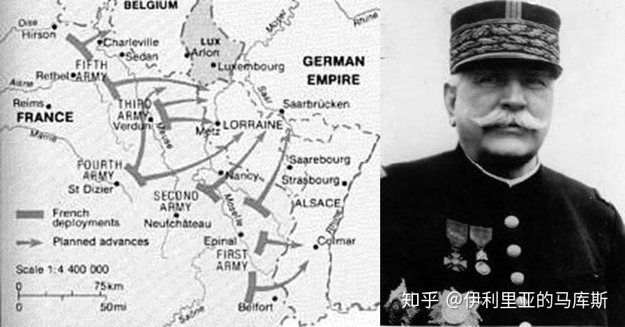 当时的德法边境全长240公里,北面是比利时,南面是瑞士。从1880年到1914年的30年间,法国人在洛林和孚日山脉修建了漫长的工事防备德国的进攻。在20世纪初的战争中,防御工事和机枪的结合,导致这种有限长度的防线非常易守难攻。比如在1904年日俄战争中的旅顺战役,俄国人在碉堡和机枪的协助下,5万人防守了旅顺5个月,让13.6万人的日军伤亡了6.2万人,连日本“军神”,陆军元帅乃木希典的两个儿子都死在了203高地上。这场防御战让德国人意识到,今后将很难再重复1870年普法战争边境战的模式,单纯的意图突破德法边境的法军防线将浪费非常多的时间和人力。