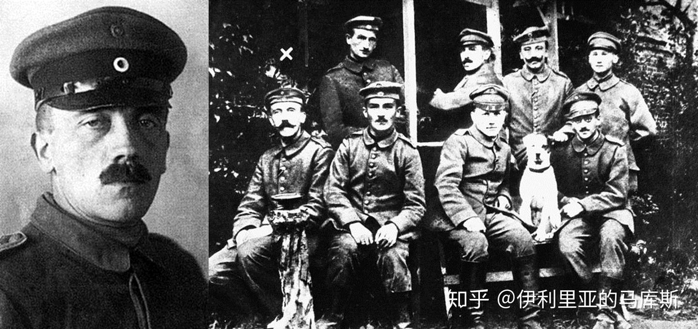 一战期间的希特勒标准照,右边图的第一排最左边是他