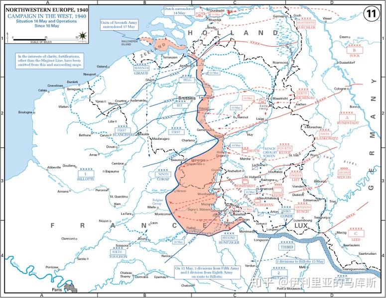 截止到1940年5月16日,西线的战况,红色的突出部显示A集团军群的突击深度