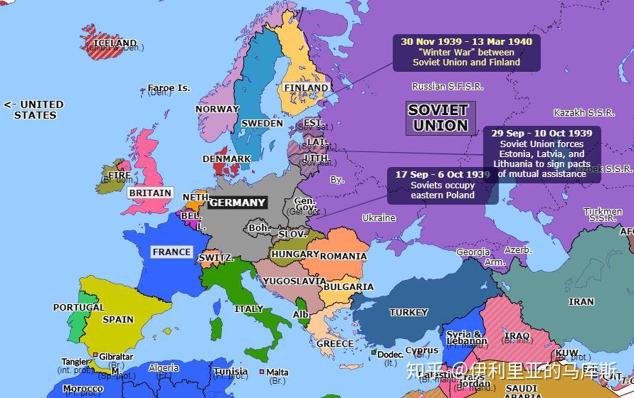 1940年初欧洲局势图,德国和苏联在1939年底瓜分了波兰
