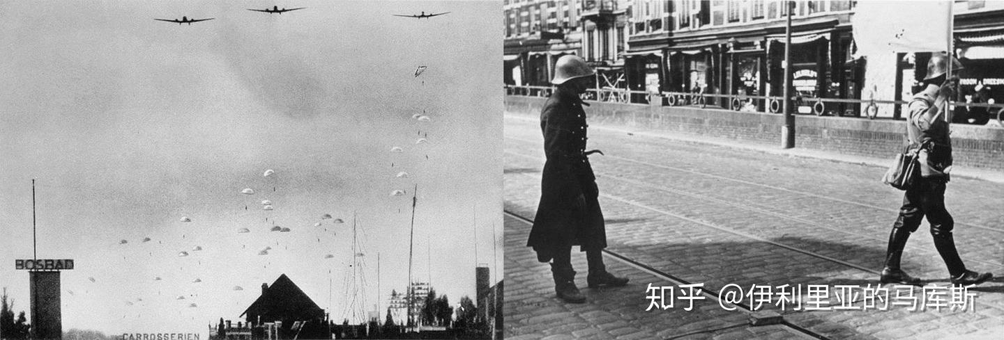 德军首次在战争中大规模使用空降部队,右图为荷兰部队举白旗投降