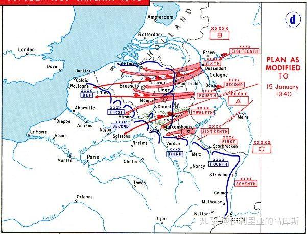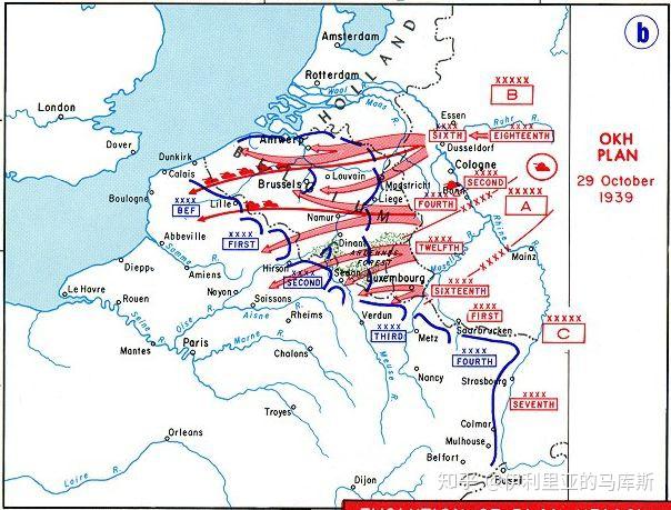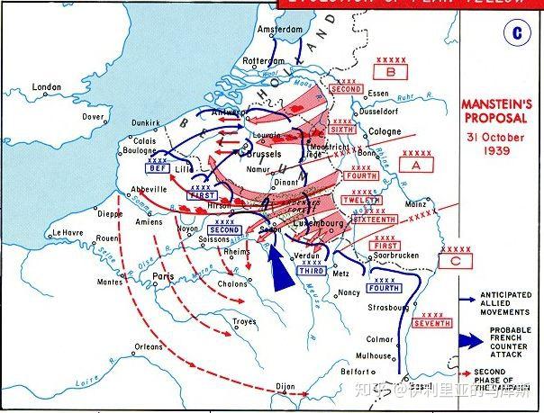 曼施坦因提出的C方案,左路的A集团军群变成了突击主力,和B集团军群在比利时围歼盟军