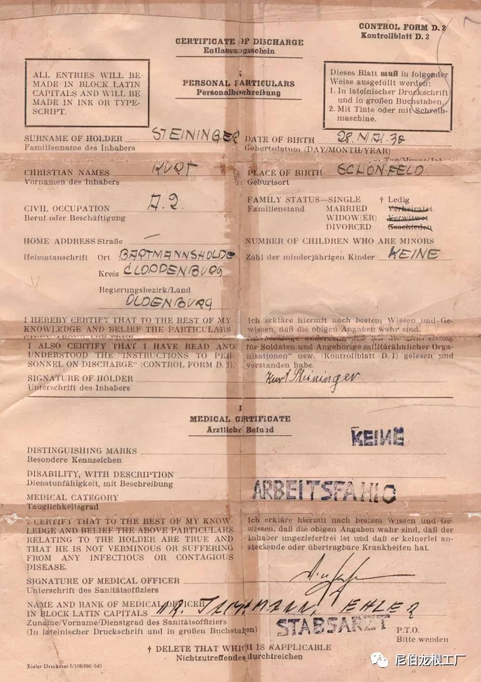 斯泰因戈尔的战俘释放证明和军饷领取证明。
