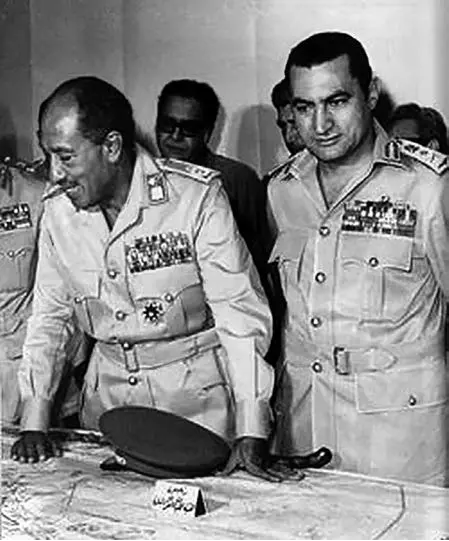 图5.埃及总统安瓦尔·萨达特(左)和埃及国防部副部长兼空军司令胡斯尼·穆巴拉克正在研究作战计划,照片摄于1973年10月