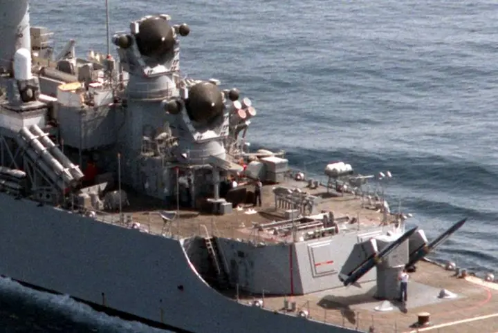 那位电子战一级士官以浓重的南方口音报告说:“敌机已用火控雷达锁定我舰。”尽管言辞紧张,他那独特的南方腔调却莫名令人放松。我还没想出该如何回答,专用电话线路里便传来命令:立刻前往舰桥。到舰桥后我才知道,舰长要求我尽可能目视确认来袭飞机的身份。作为舰上情报军官的附带职责,我早就熟记了苏联舰艇与飞机的特征。站在舰桥耳台上,我向南远眺,试图发现来袭的飞机。用眼睛的余光,我看见防空导弹发射架上的两枚导弹正在迅速调整高低角和方位角,显然是受到我舰火控雷达锁定信号的指引。交战规则禁止我们先发制人,此刻的紧张感如同西部片里对峙的枪手,站在街头彼此凝视,等待对方率先拔枪。