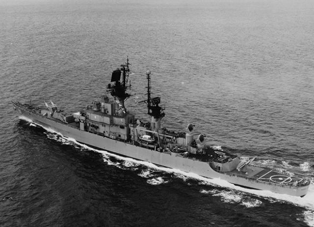 图1.美国海军“哈里·亚内尔”号驱逐领舰(USS Harry E. Yarnell,DLG-17),照片摄于1971年10月。该舰为“莱希”级二号舰,1975年美国海军舰艇分类改革后升级为导弹巡洋舰