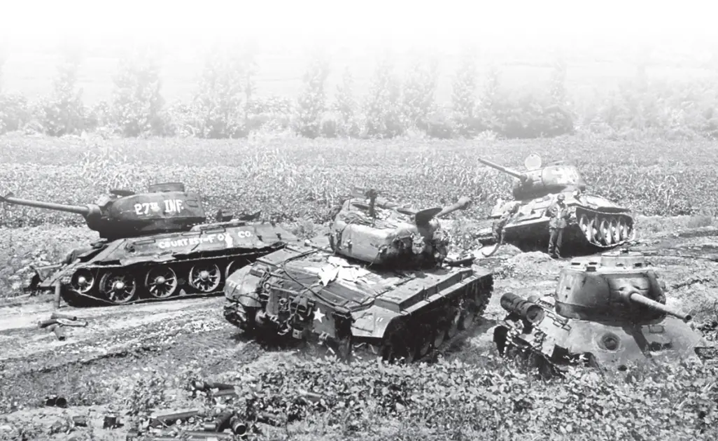 ■1950年8月27日塔布洞战斗后,一辆美军M26坦克从3辆被击毁的朝军T-34/85坦克残骸旁驶过。