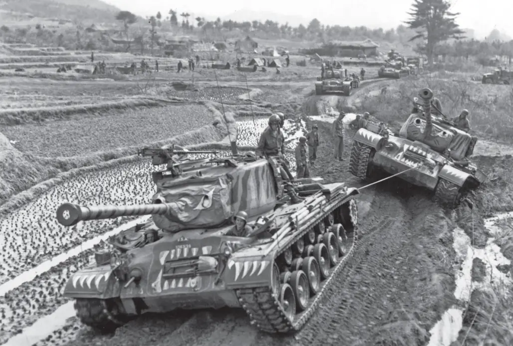 ■美军第6坦克营的一辆M46中型坦克正尝试拖曳另一辆陷入稻田的M46,该营是美国陆军第一个装备M46坦克的装甲单位。
