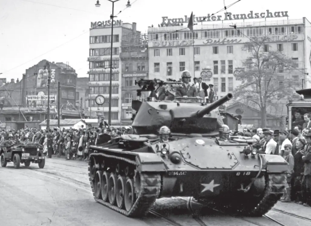 ■20世纪40年代末驻德美军的M24轻型坦克行进在法兰克福街头,当时美军驻海外的坦克部队仅执行占领任务,战斗力欠缺。