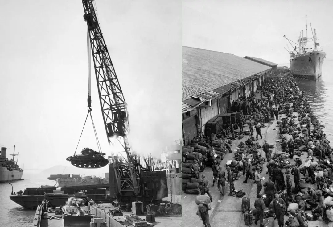 ■1950年8月,美军增援部队在釜山登陆,码头吊车正将M4中型坦克吊运上岸。