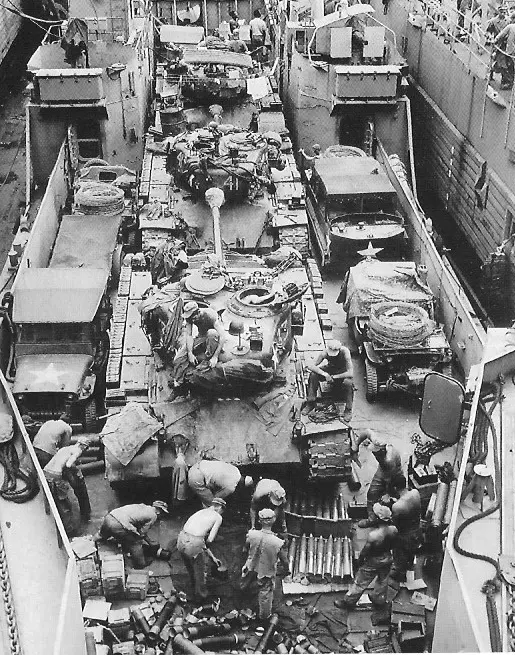 ■1950年9月,海军陆战队第1坦克营的M26坦克乘登陆舰开赴仁川海岸。