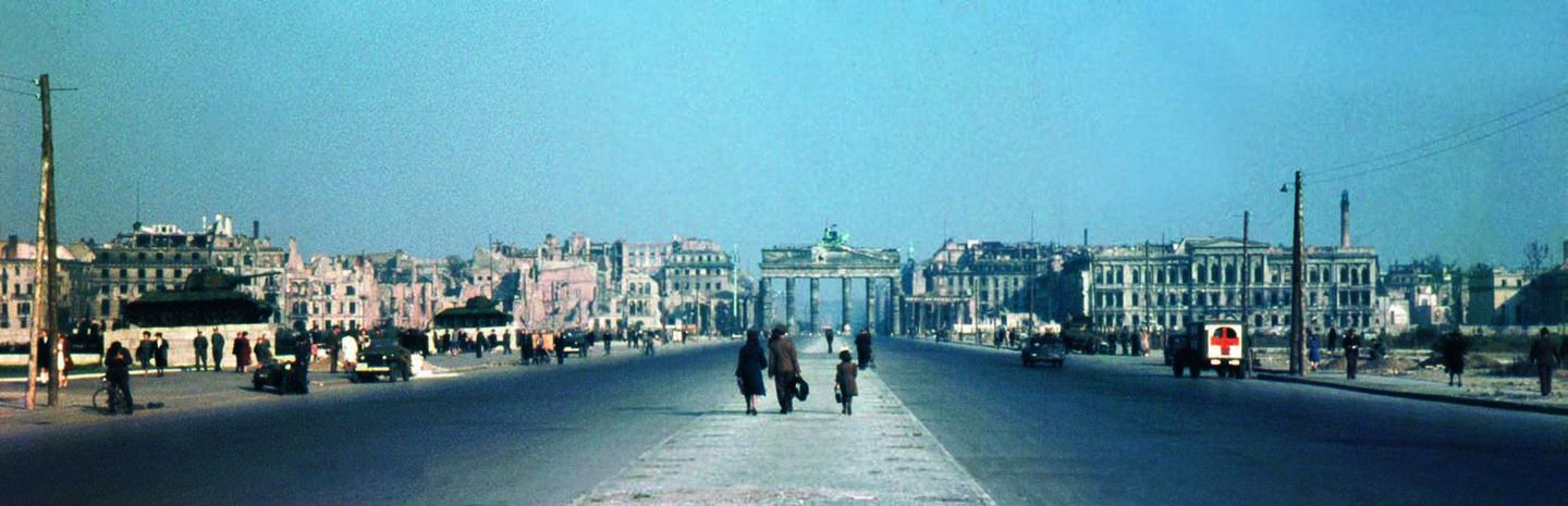 从今天的“6月17日大街”(原名夏洛滕堡大道,后为纪念1953年东柏林起义而更名)向勃兰登堡门方向望去,可以看到位于照片左侧的一对T-34坦克,这座位于动物园区的苏军战争纪念碑于1945年11月落成