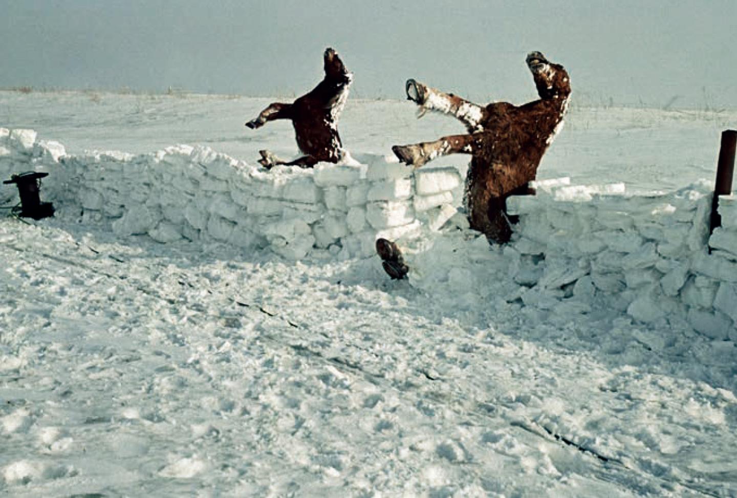 一个任何摄影师都会被吸引的骇人而诡异的场景,这些冻僵的马匹被德军通信兵临时当作电线杆来使用