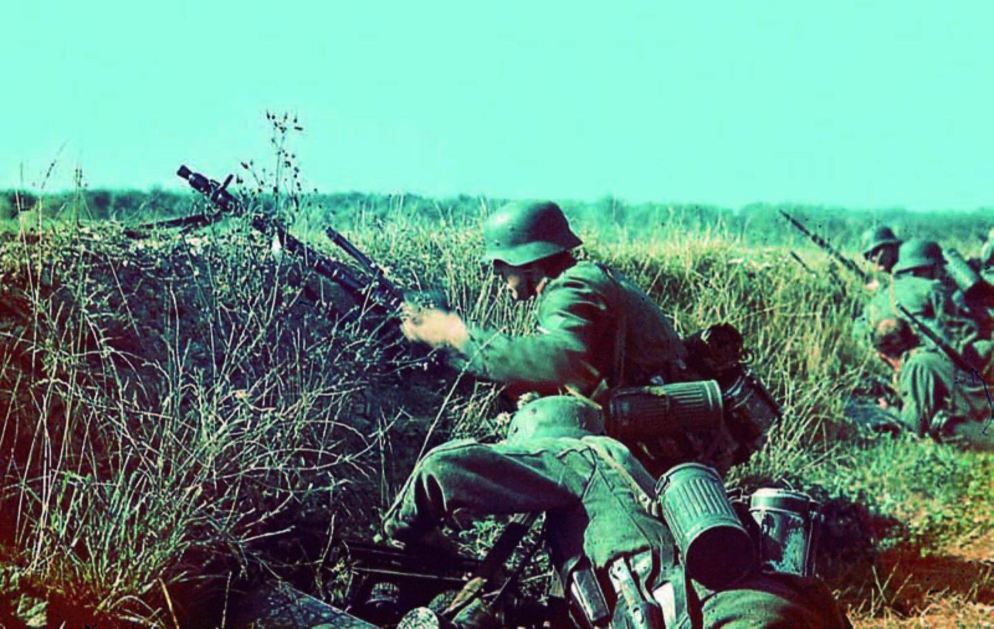 题图:正准备发起进攻的德军士兵。德军步兵班的核心是班用机枪,最初是MG 34,后来换成MG 42。机枪手配有一名副射手和一名弹药搬运兵,但在实际中,包括班长和六名步枪手在内的大多数班组成员都会携带机枪弹药