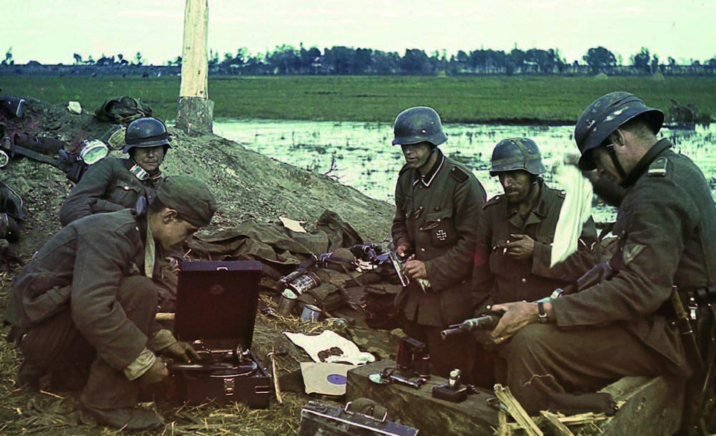正在休息中的第16装甲师的士兵们。音乐是逃避现实的一种方式。大多数部队都有手风琴或口琴等乐器和会演奏乐器的人,用音乐来鼓舞士气,或是帮助缓解战斗带来的压力与创伤。有的部队还会配备留声机