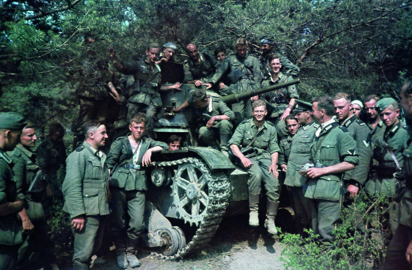 在战争初期的闪击战中,德军缴获了大量战利品,这些满身尘土的步兵正与一辆被缴获的T-26坦克合影