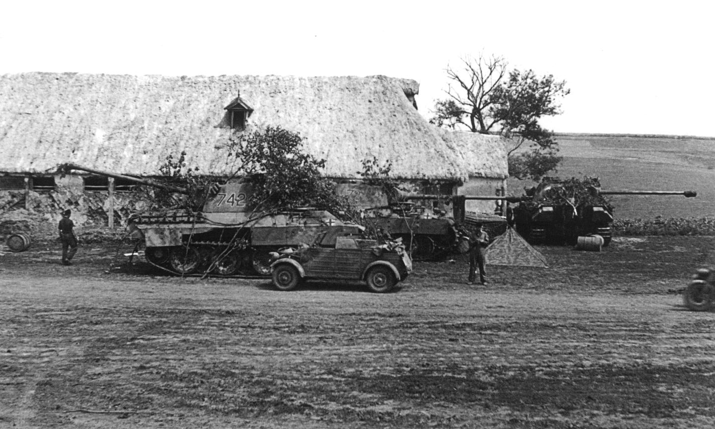 摄于“堡垒”行动期间,第52装甲营第7连的“豹”式停靠在一处农场附近,这些“豹”式车身上都覆盖着用于伪装的树枝。参加“堡垒”行动的“豹”式坦克的全损比例超过1/4,通过对缴获的“豹”式进行的装甲测试,苏军很快便掌握了“豹”式的装甲弱点。