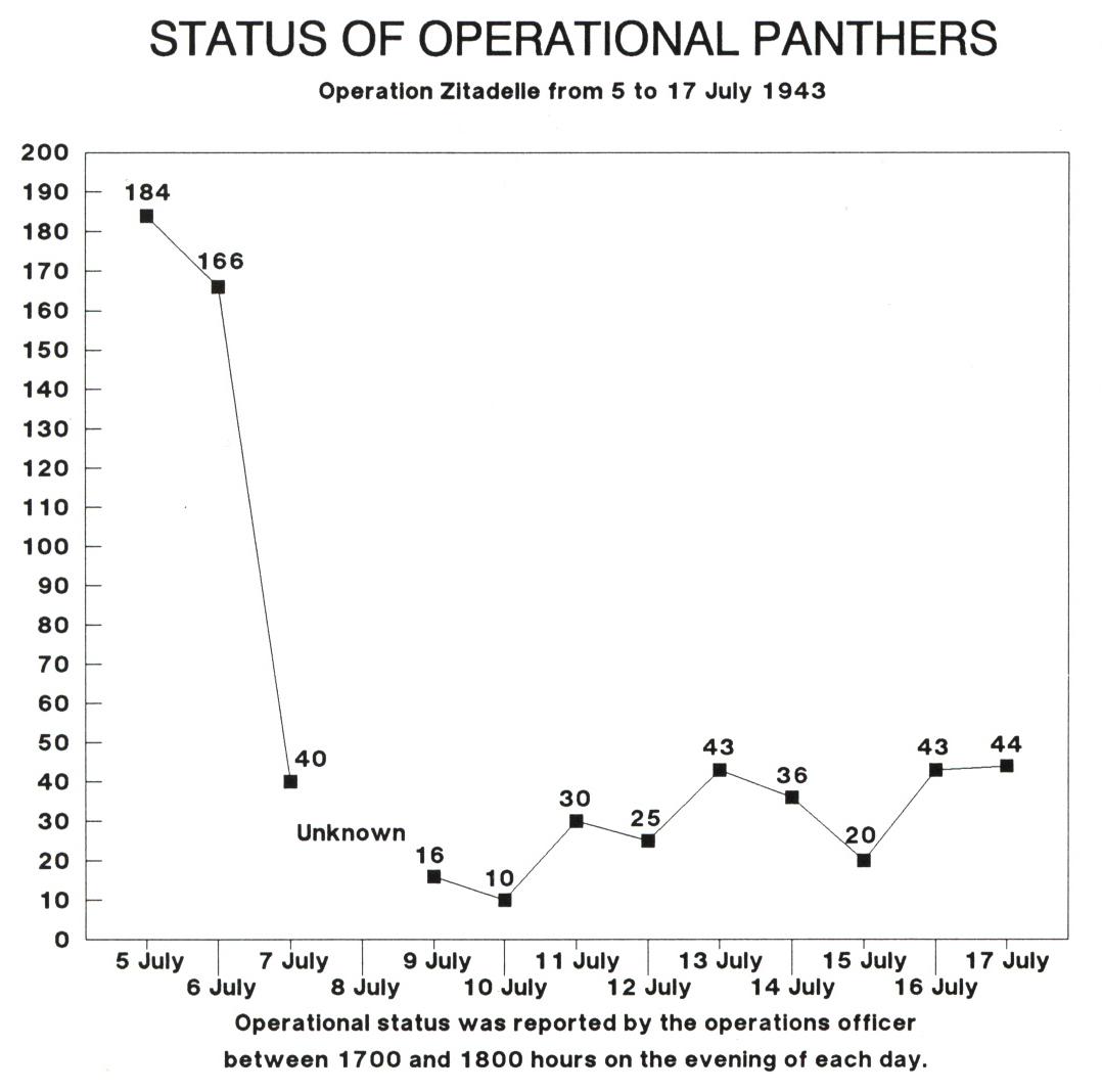 7月5日至17日的“堡垒”行动期间,第10装甲旅可用“豹”式坦克逐日数量图。该图由旅勤务官在每日傍晚17时至18日上报的作战日志汇总而成。由图可明显看出,7月6日之后,该旅可用的“豹”式数量急剧下跌,直到7月10日才开始有所回升。