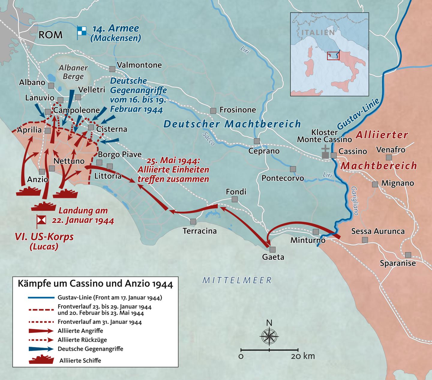 为了从后方撬开卡西诺防线并重新推动向罗马的进军,1944年1月22日,美军在距罗马以南约50公里的安齐奥(Anzio)和内图诺(Nettuno)登陆。登陆部队的任务是切断罗马与卡西诺之间的交通线,配合正在从正面进攻卡西诺的友军突破“古斯塔夫防线”。