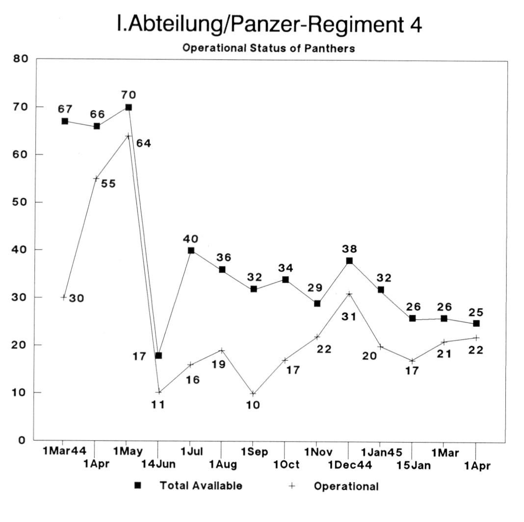 1944年3月1日至1945年4月1日,意大利战场作战期间,第4装甲团第1营可用(Total Avallable)和可作战(Operational)的“豹”式坦克的数量图。