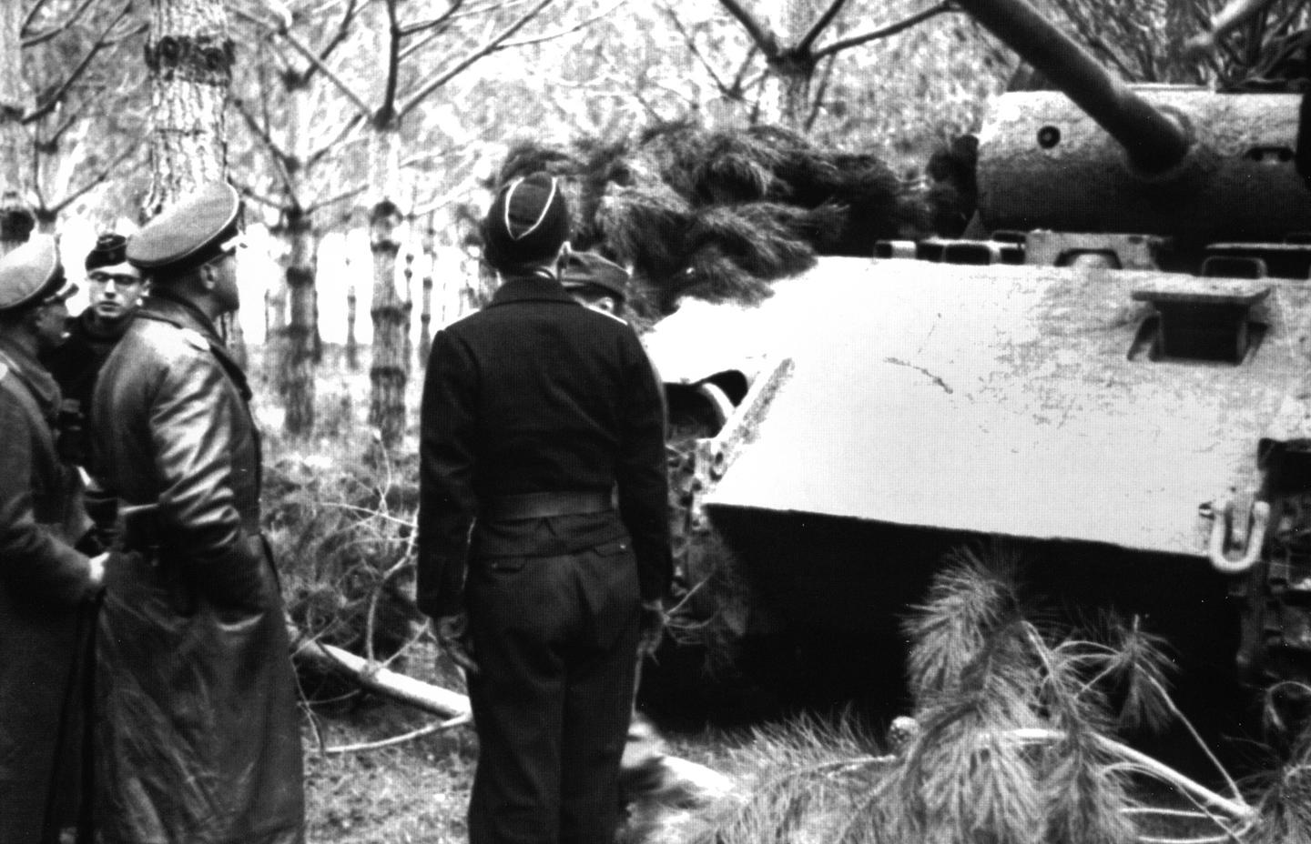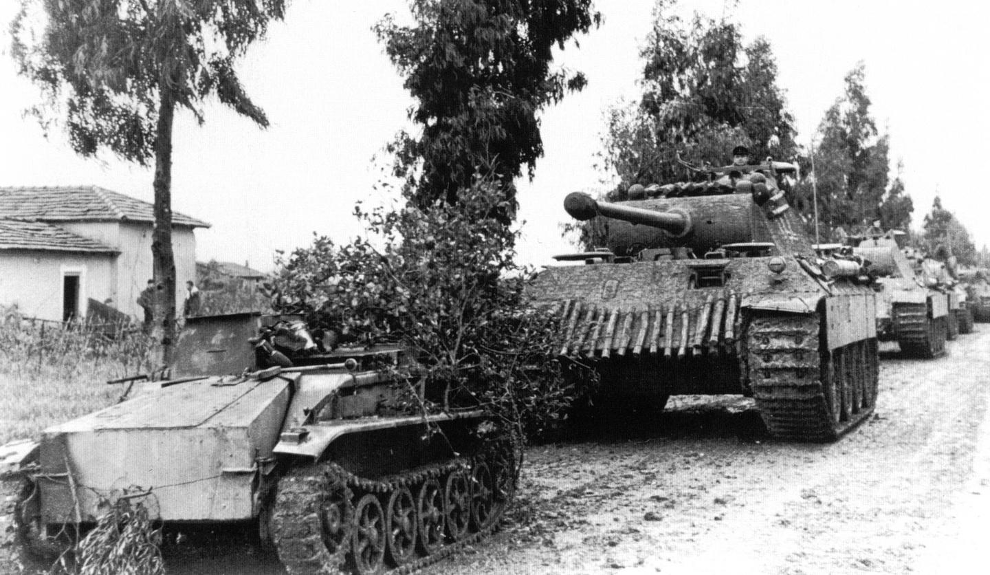 1944年1944年3月30日,第4装甲团第1营部分单位转移至普拉蒂卡迪马雷(Pratica di Mare)附近的一片松林中,第1伞兵军军长阿尔弗雷德·施莱姆(Alfred Schlemm)将军正在视察该部队。由于盟军掌握着制空权,德军必须对坦克做好良好的伪装工作。