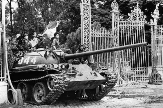 正午时分,北越人民军开着中国援助的坦克撞开了总统府的大门,杨文明带着内阁成员坐在会议室静候,他对冲进来的北越上校说,“我们在这里等候你们,以便将权力交给你们。”上校回道,“你的权力早就瓦解了,你无法交出你不再拥有的东西。”