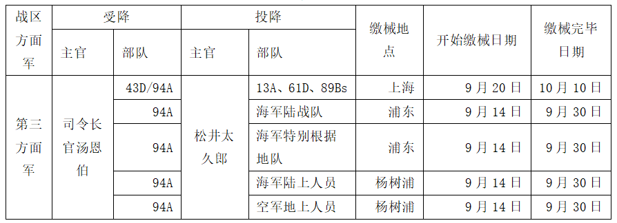 上海方面日军投降并未举行受降仪式,9月11日,汤恩伯在虹口司令部办公室面见日本第13军松井久太郎中将,交给他沪字第一号命令,饬令日军自12日起缴械投降。日俘的投降步骤基本如下:“使已到达集中地之日军,在我军监视之下,先就集合位置,再依我所指定之仓库,自动卸下一切武器,纳入库内,造册呈报,由我点收,而所有俘虏,则随即送入集中营管理。”