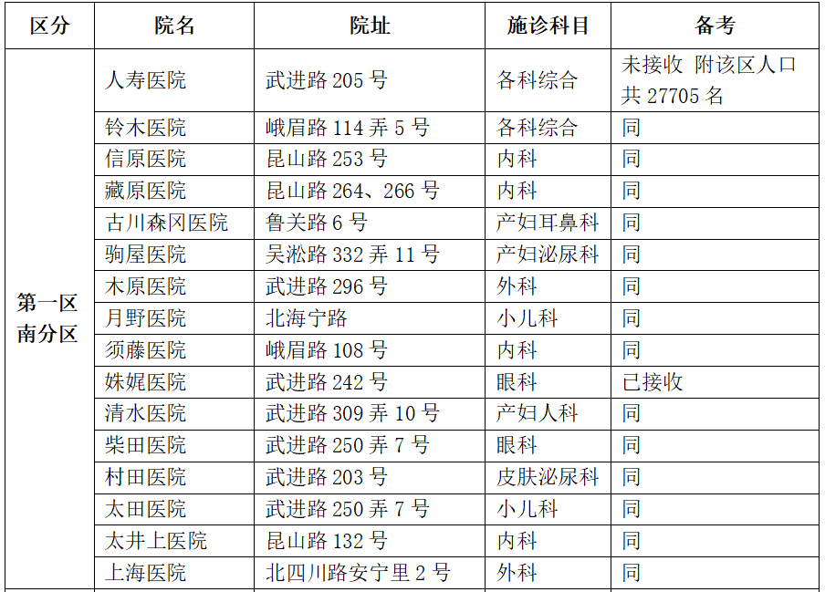 4、集中区内日侨生活规定:清洁卫生,日侨自治会负责主持,基本由日侨轮流负责,管理处随时派员视察考核;婚嫁出生之处理,依照保甲条例规定,由自治会办理后填具报告表,报告管理处备案;死亡埋葬之处理,若是有日侨死亡,则由其所在户之户长上报甲长、保长至区长,经日侨自治会转报管理处备案,填具死亡报告表并签发火葬通行证;疾病治疗,经管理处指定集中区域内的日侨医院为专门的日侨治疗机构。日侨管理处在集中区内将原有日本医院改为日侨管理处直属医院六所,仁寿医院一、二、三所及田中、川村、难波医院三所。然而由于日侨人数众多,同时还有源源不断从华中地区汇集过来的日侨,因此后增设医院到29所,如下表: