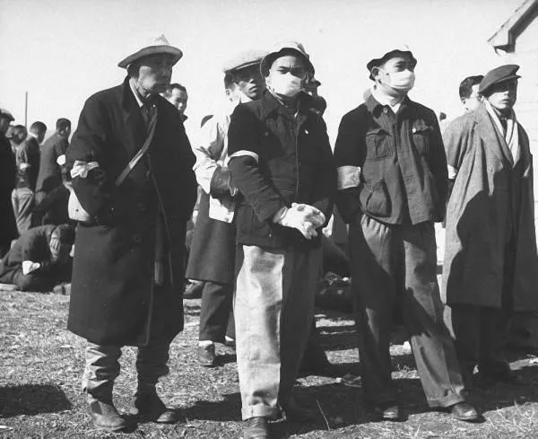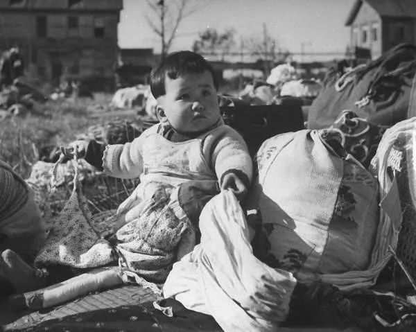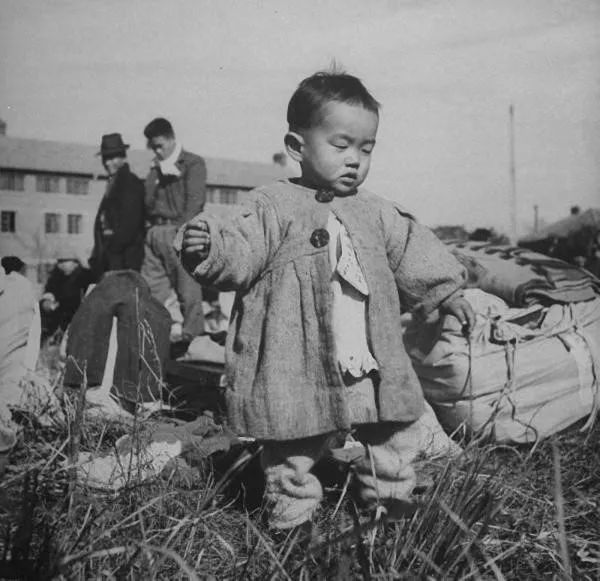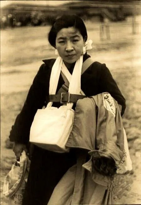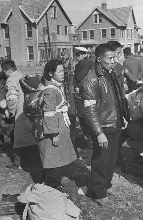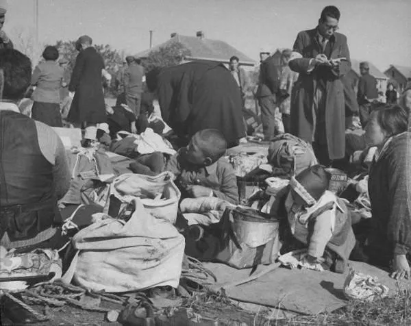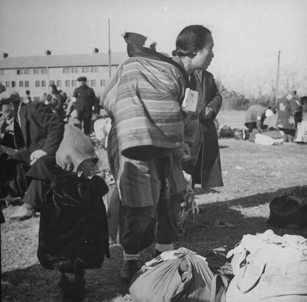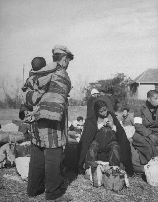 日本女子背着行李和丈夫的骨灰袋等待遣返归国