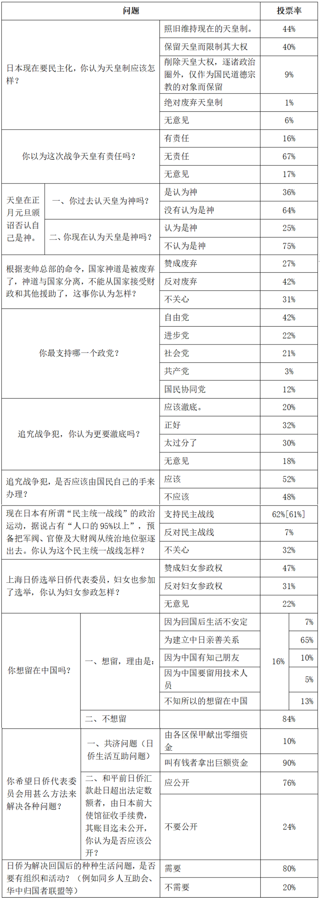 此次民意测验可看出,日侨看待天皇制,以保留居多,即照旧维持或限制权力,认为可完全废弃天皇制的仅有1%。日本人对于天皇制有着根深蒂固的感情,可以说是变成了一种信仰,难以通过战争失败而骤然拔除。当然,其中主张照旧维持者不到半数,同时以前认为天皇是神而现在依然这样认为的比例亦已经减少,从36%降到25%。我们至少可以认为,日本人在当时已经对天皇的绝对神圣性有了批判性的想法。