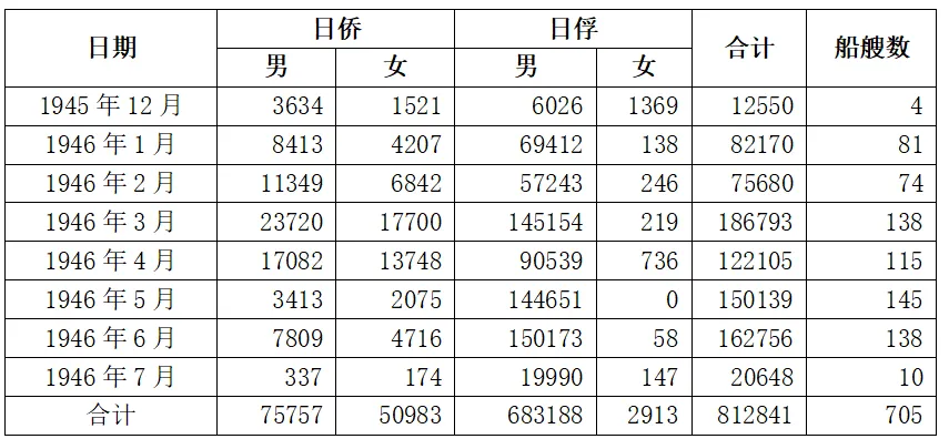 1945年12月到1946年1月间,由于估计不足和调配船只困难,加上经验不足发生船难,仅有28艘船供使用。到了2月份,遣返船只增加到59艘,但仍赶不上大量等待遣返的日俘侨人数,进展十分缓慢。这迟缓的进程恰好印证了前期日俘侨对遣返速度的揣测,一种不安情绪又开始在人群中发散开来。从3月份起,遣返船只开始大量增加,达到了123艘,遣返速度大大加快。到1946年7月为止,上海日俘侨的遣返工作已经基本完成。此后,便是小规模、零星的遣返,政府不再组织集中管理。