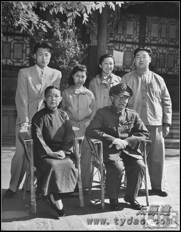1947年拍摄的阎锡山家庭照,前排为阎锡山与徐兰森,后排右侧为四子阎志敏、四儿媳裴彬,左侧为五子阎志惠,左二为孙女阎树榕,二儿媳赵秀金未出镜