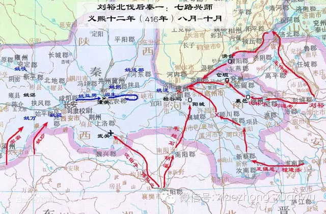 这是两国的战略决战,因此刘裕兵分五路,尽起全国精锐:檀道济、王镇恶率步兵沿淮河、淝水向许昌、洛阳进发;建武将军沈林子率水军自汴水溯黄河西进;冀州刺史王仲德都督前锋诸军,由彭城经泗水、巨野泽进入黄河;新野太守朱超石率军由襄阳进攻阳城(今河南开封东南);振武将军沈田子、建威将军傅弘之由襄阳挺进武关,牵制关中。刘裕亲率水军劲旅驻扎彭城,等水路全部打通,便督军西进。