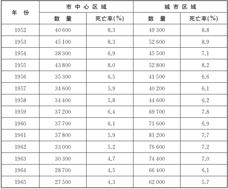 1949年之后,即便死亡率是处于下降的状态,死亡数字仍随着人口膨胀而上升。当然,由于有大量民众的死亡未被记录在案以及其尸体被倾倒在大街上,20世纪50年代早期的统计数据低估了死亡数量。卫生局承认由于存在上述现象导致关键的统计数据并不完整且有片面性。卫生局大概花了10年才将这一长期存在的情况画上句号。在三个城市区域中进行初步的实验之后,卫生局最终设计了一个方案,将所有的出生和死亡数据录入一个统一的强制性报告系统之中。从1950年7月—1951年6月,所记录的死亡总数达到64834人,但街边露尸的总数达到44661人。换句话说,死亡总数至少是98595人,该数据意味着死亡率增长了三倍。这些细微的区别在后来的统计重建中消失不见了。年报和类似出版物中所披露的数字和在档案中所找到的数字大相径庭。上海市和市区中的死亡数字直到1955年都保持着稳定的状态,然后逐年下降直到20世纪50年代末(详见表1.2)。从1959年开始一直到20世纪60年代前半期,死亡数字稳步下降,很可能反映了医疗服务质量和城市中生活条件的改善。