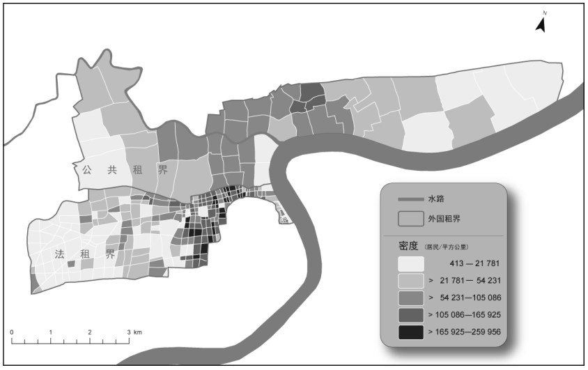 外国租界的平均人口密度要低得多(详见地图1.2)。在公共租界,人口密度从1900年的13456人增至1935年的50838人。人口的分布并不均衡,而且在某些地区呈现出密度更高的状态,只有靠近闸北的北区在1935年时的数据超过10万人。最小的中区,在同一时期或多或少保持着相同的密度水平(11.7万至13.2万人)。法租界由于其地界面积更小的关系,人口密度始终更高。直到1914年最后一次扩界之后,法租界的平均人口密度从1879年的48086人到1910年的80518人,1914年时跌至42545人。在缺乏高层住宅楼的情况下,1949年前上海的人口密度相比欧洲或美国城市,是相对较高的。纽约人口密度最高的区域在曼哈顿,1910—1920年达到峰值4万人。1913年,巴黎的平均密度是3.7万人,高于柏林(2.65万人)和伦敦(1.61万)。但在19世纪中叶,巴黎部分街区的密度在9万人至13.6万人。在1923年关东大地震前夕,东京大部分城市区域的人口密度是2.8万人。总而言之,上海的人口密度让任何19世纪中叶,甚至更晚去城市谋生的欧洲人都相形见绌。