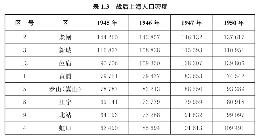 1945年,即便战争在先前公共租界中区导致人口密度的增加,人口分布或多或少都差不多。在整个战后阶段,人口最高的仍然是那些区域(详见表1.3)。人口密度如此集中并没有给传染病本身提供温床,但一旦疾病暴发,这样的密度给类似疾病的传播创造了环境。