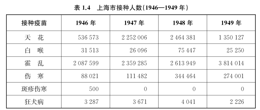 传染病在战后仍是一个挑战。1949年的一份市政报告指出传染病在1946年至1949年9月呈现稳定的下降状态,从1946年的9135例到1947年的5542例,再到1948年的7175例以及1949年前9个月的3733人,这些传染病案例分别造成了2286人、1690人、2196人和902人死亡。死亡率达到25%至30%的传染性疾病仍然是一个严重威胁。但从那时开始,政府准备对新案例的出现进行应对,将这些病人迅速转移到一所独立的医院中。即便传染病在城市中不可控,但由于医疗服务和更严格地监管人口,传染病所造成死亡人数要少得多。这也反映了接种的效果,数十万居民在1946—1949年接受了对抗传染病的接种(详见表1.4)。