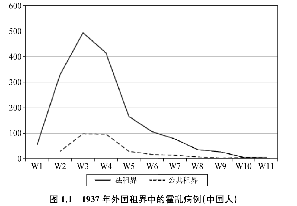 霍乱于1937年和1938年再一次侵袭上海,就在1937年8月日本攻击上海,人口随即大规模迁移进外国租界之后。在这两年中,霍乱杀死了约1/5的病人。缺乏足够的医疗设施、医疗报告错误和诊断延误这些因素一起导致了高死亡率。1937年的霍乱病情开始得很晚,暴发于8月28日,这和8月中期开始中日之间持续到12月的冲突有关。病情的传播非常突然,然后在两个月后消失。图1.1所代表的是霍乱在中国人口中传播的不完整数据。我们可以从图中推测出霍乱的传播和造成大量死亡的速度有多快。在病情暴发后的第五周,霍乱已经在1742个病例中导致了349人死亡。根据法租界的报告,除了他们的数据之外,难民营并不是传播的核心区域。对医疗服务的主要担忧是难民营缺乏集中管理以及因此导致的无法开展合作和连贯的预防措施。