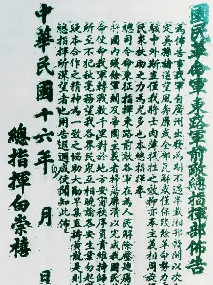 白崇禧发布的国民革命军东路军前敌总指挥部布告