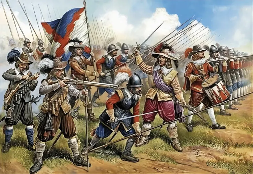 图5 荷兰联省共和国军队作战方阵,画面左端可见排队射击的火绳枪手,支架是用来支撑枪管以利于瞄准的。