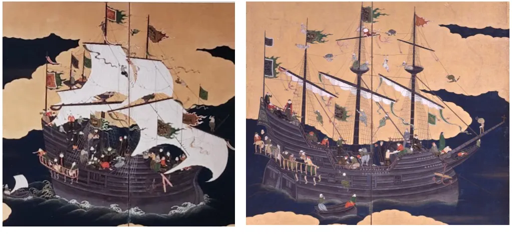 左图14,《南蛮人渡来图》左屏中的帆船,右图15《南蛮人渡来图》右屏中的帆船