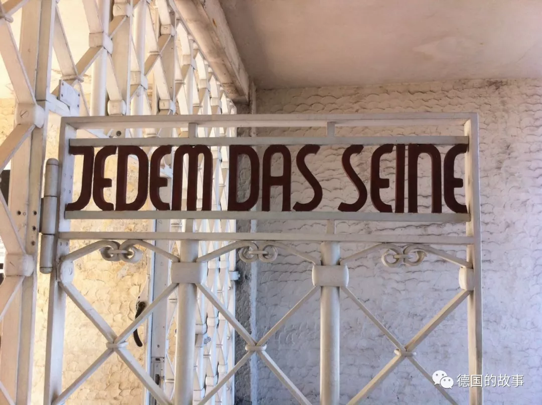 首先有必要花费一些笔墨说一下铁门上的标示文字 JEDEM DAS SEINE 的出处以及怎么样才能比较准确地用汉语表达原意。JEDEM为德语“每人”的属格或接受格,DAS SEINE 德语的意思是“他的(东西),他的(那份)”,上下文连接起来的意思是“每人(属于或得到)他那一份”。古希腊先哲在描述公平分配的理想状态时已经表露了这一概念。从柏拉图到亚里士多德,均将公民公平地得到,并守护他应得的一份作为理想社会的游戏规则加以肯定。而把这一社会伦理概念引入政治和法律范畴的则是古罗马时期的西塞罗(Cicero 前106 – 43)。西塞罗首次以拉丁短语 suum cuique(德语对应译为 JEDEM DAS SEINE)表述这一原则,之后这一短语演变成了强调社会公正的警句。到了集民法大成者皇帝查士丁尼时期,更是把 suum cuique 作为法律保障公正的精髓,用查士丁尼的话概括说:有尊严地生活,善待他人,谨守其份。