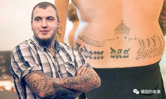 2015年圣诞节前,原东德地区勃兰登堡州奥朗宁堡法院引人注目地受理了当地一起因 JEDEM DAS SEINE 标示而引发的案件:一个月之前,在奥朗宁堡(原东德地区,萨克森豪森集中营所在地)一水上乐园里,一位泳装肥男的近屁股区域赫然出现纳粹集中营塔楼电网的图样和 JEDEM DAS SEINE 标示的刺青,一记者泳客惊骇之下向乐园管理员反映,却被视作大惊小怪。该记者不依不饶,将肥男刺青拍摄后发布在网上,并作为证据直接报警,终于迫使警方调查并起诉该肥男。据悉,肥男名 Zech,汉语读作菜盒,事发时27岁,为德国右翼民族党(NPD) 的县议员,约略等同于我们的县人大代表,为在野的德国民族党的基层干部。蹊跷的是,德国的右派政党分子特别是基层成员一般都较肥胖,与其自诩的优等种族形象相距甚远。