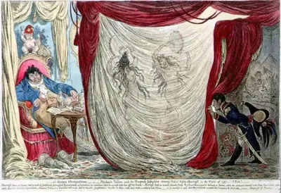 当时的政治漫画,左为巴拉斯,中间裸体舞蹈的是约瑟芬和特蕾莎,右边偷窥者为拿破仑